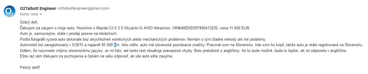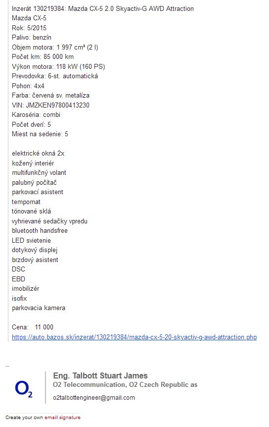 | TLC | Slovensko | 604614452 | o2talbottengineer@gmail.com | Mazda | CX 5 | TT099FZ | 11000 | Správa od predajcu Inzerát Fotografie |